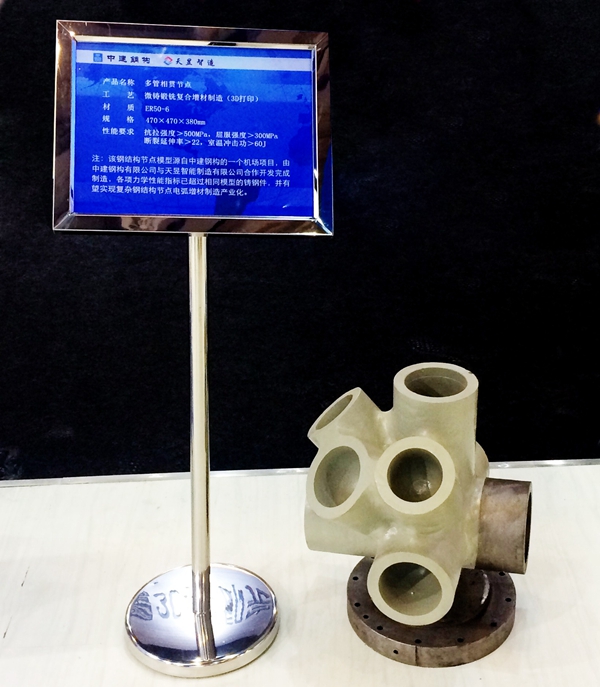 其中,多管相貫節(jié)點為天昱為中建鋼構(gòu)一個機場項目的研發(fā)成果,由1個主管和8個副管組成,總重為256kg,最大尺寸為700mm。與傳統(tǒng)鑄造工藝相比,3D打印制造的時間縮短20%,成本減少30%,材料利用率接近95%,節(jié)點的各項力學(xué)性能指標(biāo)都超過了鑄鋼件的國家標(biāo)準(zhǔn)。