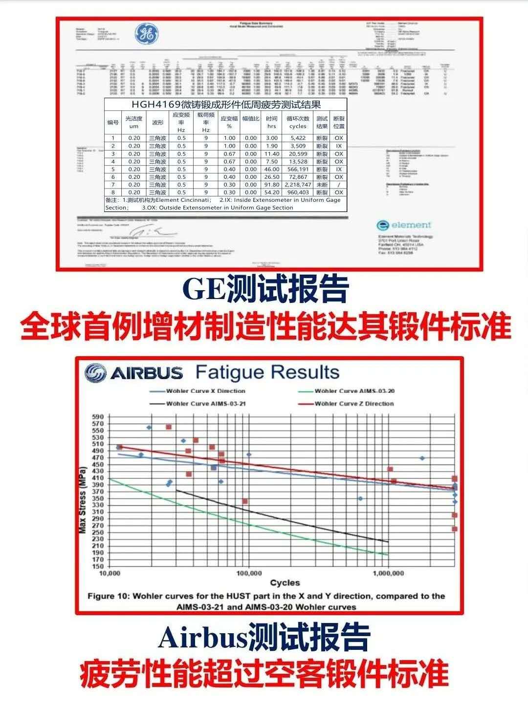 ▲上圖—美國GE提供的高溫合金疲勞性能測試結(jié)果表明,天昱智造開發(fā)的高端金屬零部件全部達(dá)到GE鍛件性能標(biāo)準(zhǔn);下圖—?dú)W洲空客提供的鈦合金疲勞性能測試結(jié)果也同樣喜人。