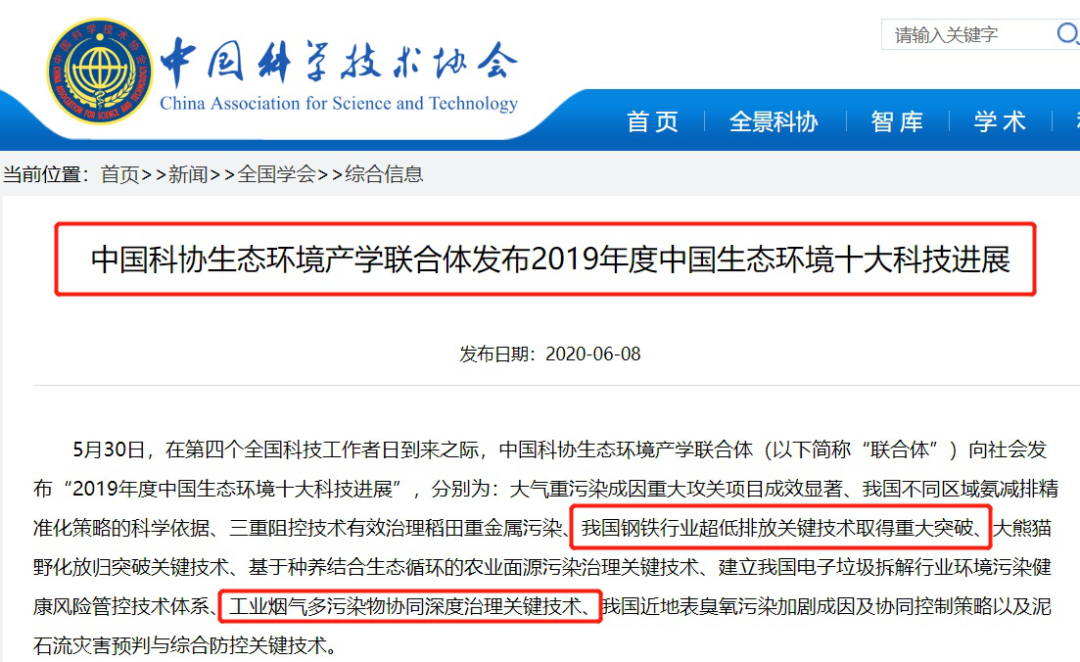 近日,中國科協(xié)生態(tài)環(huán)境產(chǎn)學(xué)聯(lián)合體發(fā)布了2019年度“中國生態(tài)環(huán)境十大科技進(jìn)展”名單,中鋼國際子公司中鋼集團(tuán)天澄環(huán)保科技股份有限公司(簡稱“中鋼天澄”)參與的“我國鋼鐵行業(yè)超低排放核心技術(shù)”及“工業(yè)煙氣多污染物協(xié)同深度治理關(guān)鍵技術(shù)”兩項(xiàng)科研成果榮列榜單,中鋼天澄也是唯一一家有兩項(xiàng)技術(shù)入選名單的企業(yè)。