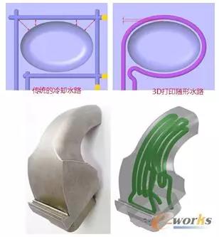 一個(gè)典型的應(yīng)用就是模具行業(yè)隨形冷卻金屬模具的制造。金屬模具冷卻系統(tǒng)是設(shè)計(jì)模具工程之一,傳統(tǒng)的模具冷卻系統(tǒng)是以直線的水路設(shè)計(jì)為主,制作較簡(jiǎn)易,但需要的散熱時(shí)間較長(zhǎng),直接影響了脫模時(shí)間、制品質(zhì)量、制品外觀等。設(shè)計(jì)者通過軟件分析模具與水路的散熱情形,設(shè)計(jì)出了異型水路,但是受到既有加工技術(shù)的限制,使得異型水路設(shè)計(jì)只能停留在理論階段。金屬增材制造技術(shù)出現(xiàn)后,使這些問題獲得了突破性改善。據(jù)悉,通過金屬3D打印的異型水路模具設(shè)計(jì)時(shí)間減少了75%、制造端人力節(jié)省了50%、射出模具生產(chǎn)周期縮短了14%、制造費(fèi)用降低了16%等。