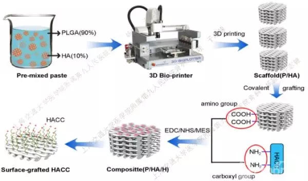 在骨科臨床上,大段的骨缺損常伴有傷口的污染或開放,存在較高的感染風(fēng)險(xiǎn)。植入的材料在某種程度上也創(chuàng)造了細(xì)菌粘附生長的載體或微環(huán)境,細(xì)菌可在其表面形成生物膜,而生物膜的形成是感染發(fā)生的關(guān)鍵環(huán)節(jié)。近期,上海交通大學(xué)醫(yī)學(xué)院附屬第九人民醫(yī)院骨科湯亭亭教授團(tuán)隊(duì)利用3D打印方法,制備了聚乳酸-羥基乙酸共聚物/羥基磷灰石(PLGA/HA)復(fù)合多孔生物支架并表面接枝殼聚糖季銨鹽(HACC);體內(nèi)外研究表明,該人工骨組織修復(fù)支架不僅具有很好的成骨能力,還兼具良好的抗菌活性。由于目前大多數(shù)骨缺損修復(fù)材料或技術(shù)都只著眼于無菌環(huán)境下的骨修復(fù);此種兼具抗菌性能的人工骨組織替代材料,對臨床上高感染風(fēng)險(xiǎn)或已感染骨缺損的防治具有重要應(yīng)用價值。