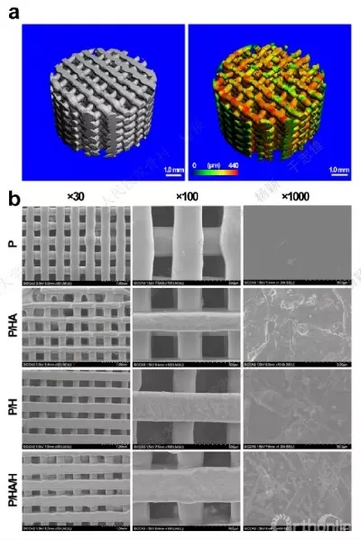 Fig.2. Morphological characterization of 3D-printed composite scaffolds. (a) 3D reconstructed images ofthe scaffolds obtained using micro-CT; (b) Representative SEM images of the porous, composite scaffolds.