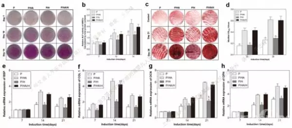 Fig.4. Osteogenic differentiation evaluation of various scaffolds. (a) ALP staining after osteogenic induction for 7, 10 and14 days. (b) Quantitative analysis of ALP activity. (c) Alizarin-red staining and (d) its quantitative analysis after 21 and 28 days induction. Relative mRNA expression of osteogenic differentiation-related genes in hBMSCs grown on various of scaffolds measured by real-time PCR after 7, 14 and 21 days induction: (e) BSP, (f) COL 1, (g) OCN and (h) OPN.