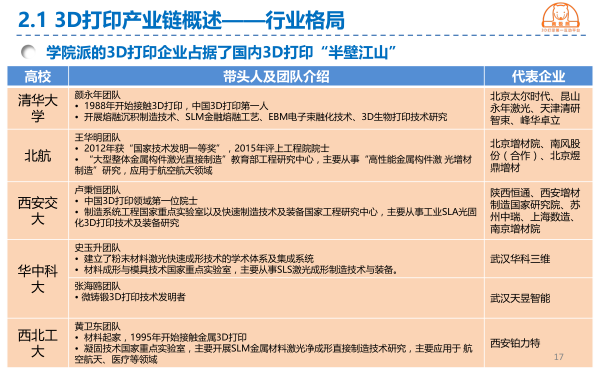 該報告統(tǒng)計了全球當前最為先進和成熟的8大3D打印技術(shù),并逐一說明其當前應(yīng)用情況。中國3D打印此前呈現(xiàn)“清華、交大、華科”三足鼎立的局勢,三大學院派占據(jù)了中國3D打印幾乎整個江山。然而,隨著行業(yè)的發(fā)展,這一局勢發(fā)生了明顯的變化。