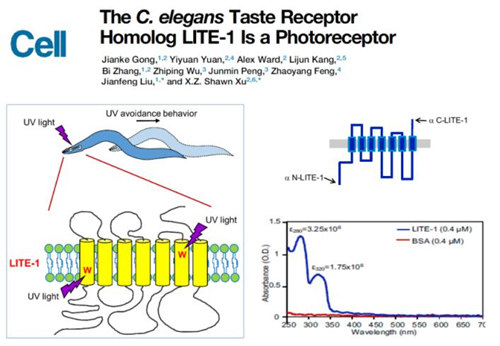 生命學(xué)院劉劍峰教授及其合作者許獻(xiàn)忠教授對線蟲味覺受體同源蛋白LITE-1的感光機(jī)理進(jìn)行研究,揭示了自然界一種從未被發(fā)現(xiàn)的新型感光機(jī)制,極大拓展了對于生物體感光機(jī)制及生理意義的認(rèn)知,在基因工程技術(shù)中有重要應(yīng)用前景。