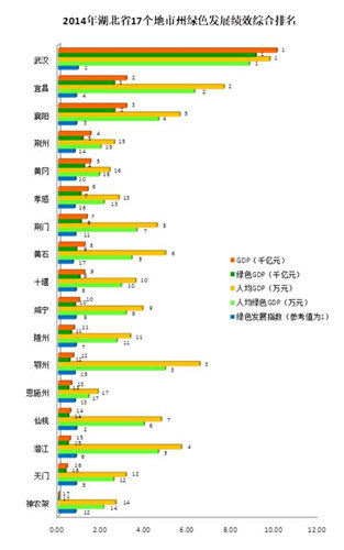 2014年湖北省17個地市州綠色發(fā)展績效綜合排名